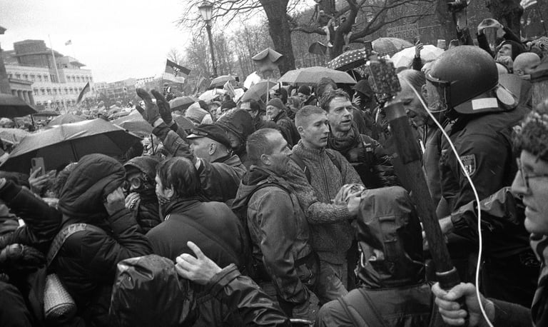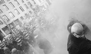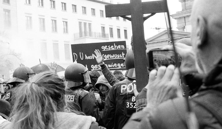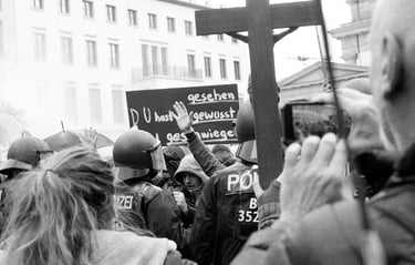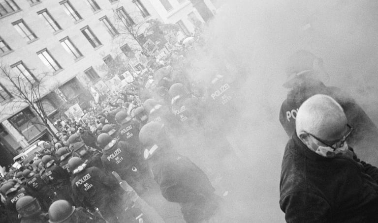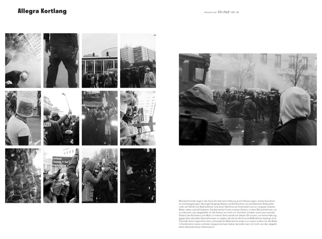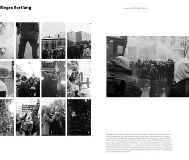 The series b2020 is about the demonstrations 2020 of coronaleugner and fascists, in which I tried through different artistic approaches, such as cropping images, photographing analog, photographing only B/W, rotating and combining images, to find a way to show my own opinion in documentary images and not just publish things I do not support, but still want to show. It was made in cooperation with the Museum Hamburger Bahnhof Berlin, as a response to Michael Schmidt's retrospective, and led to a newspaper print and an exhibition, at SOX, a showcase on Oranienstrasse Berlin.